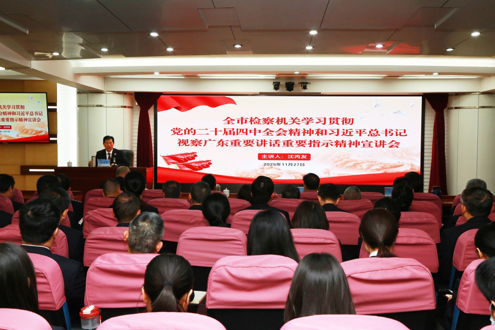 11月27日下午,东莞市检察院组织开展全市检察机关学习贯彻党的二十届四中全会精神和习近平总书记视察广东重要讲话重要指示精神宣讲会,市委宣讲团成员、市检察院党组书记、检察长沈丙友作宣讲报告。会议以视频方式开至各市区检察院。